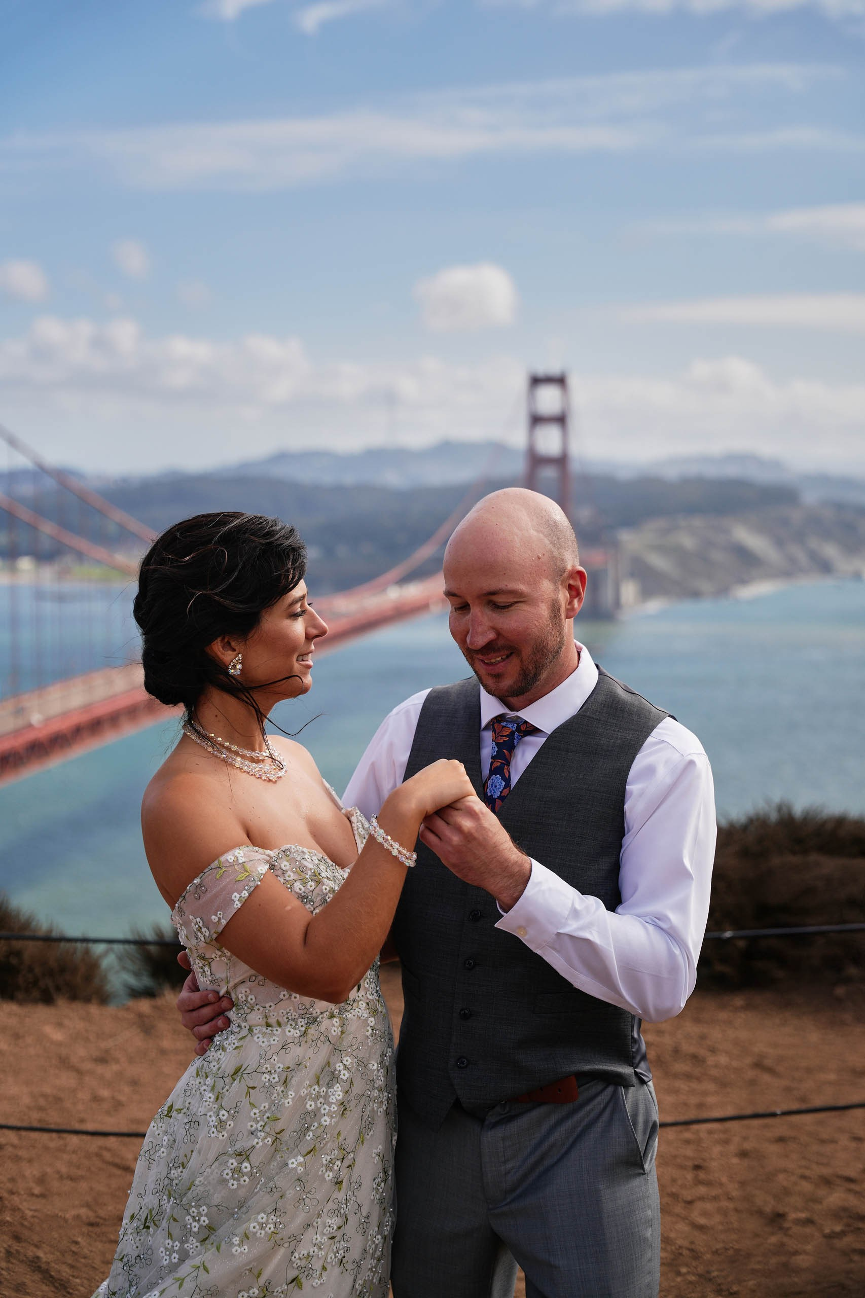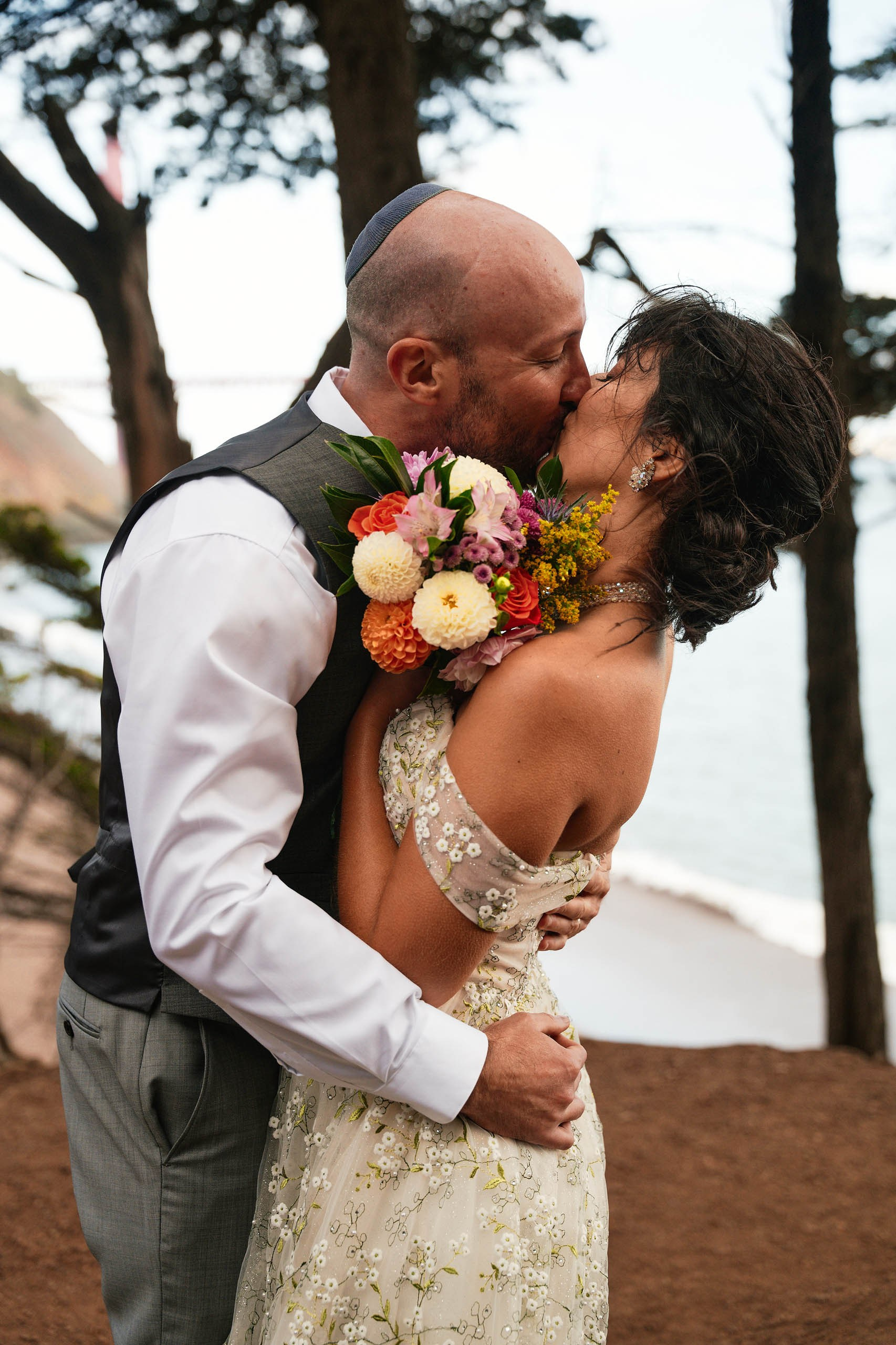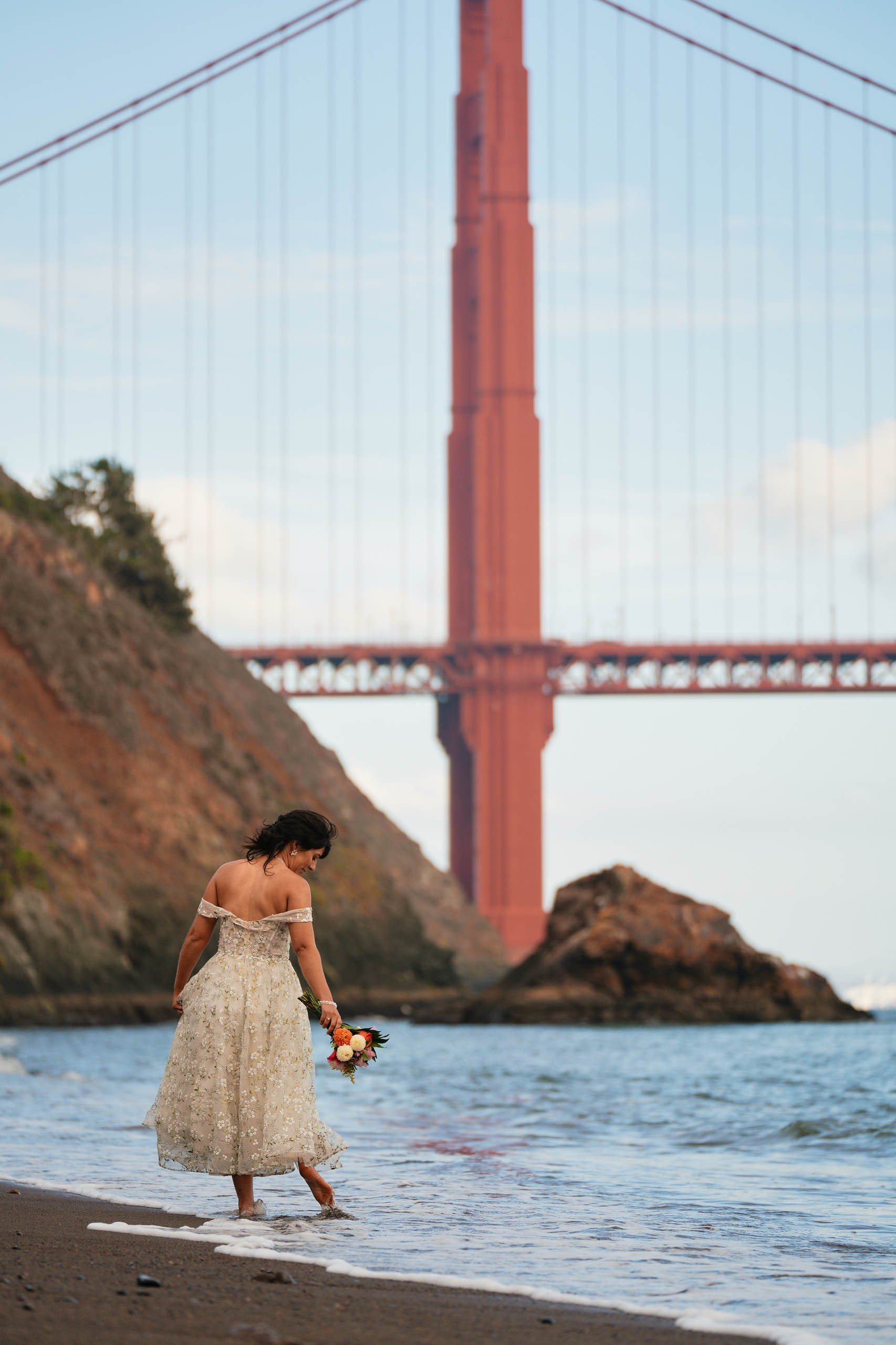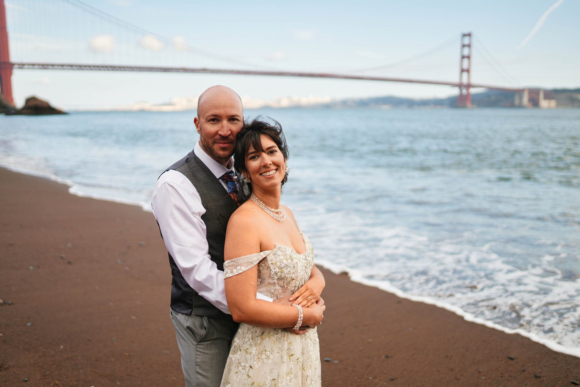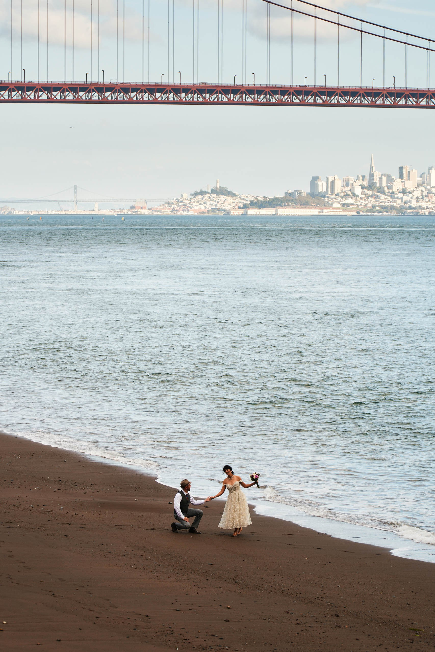 This intimate elopement at Kirby Cove, just below the Golden Gate Bridge, is a perfect example of how small weddings can be powerful, emotional, and beautifully personal. The ceremony took place on the beach surrounded by soft coastal light, ocean breeze, and quiet views of San Francisco’s most iconic landmark.