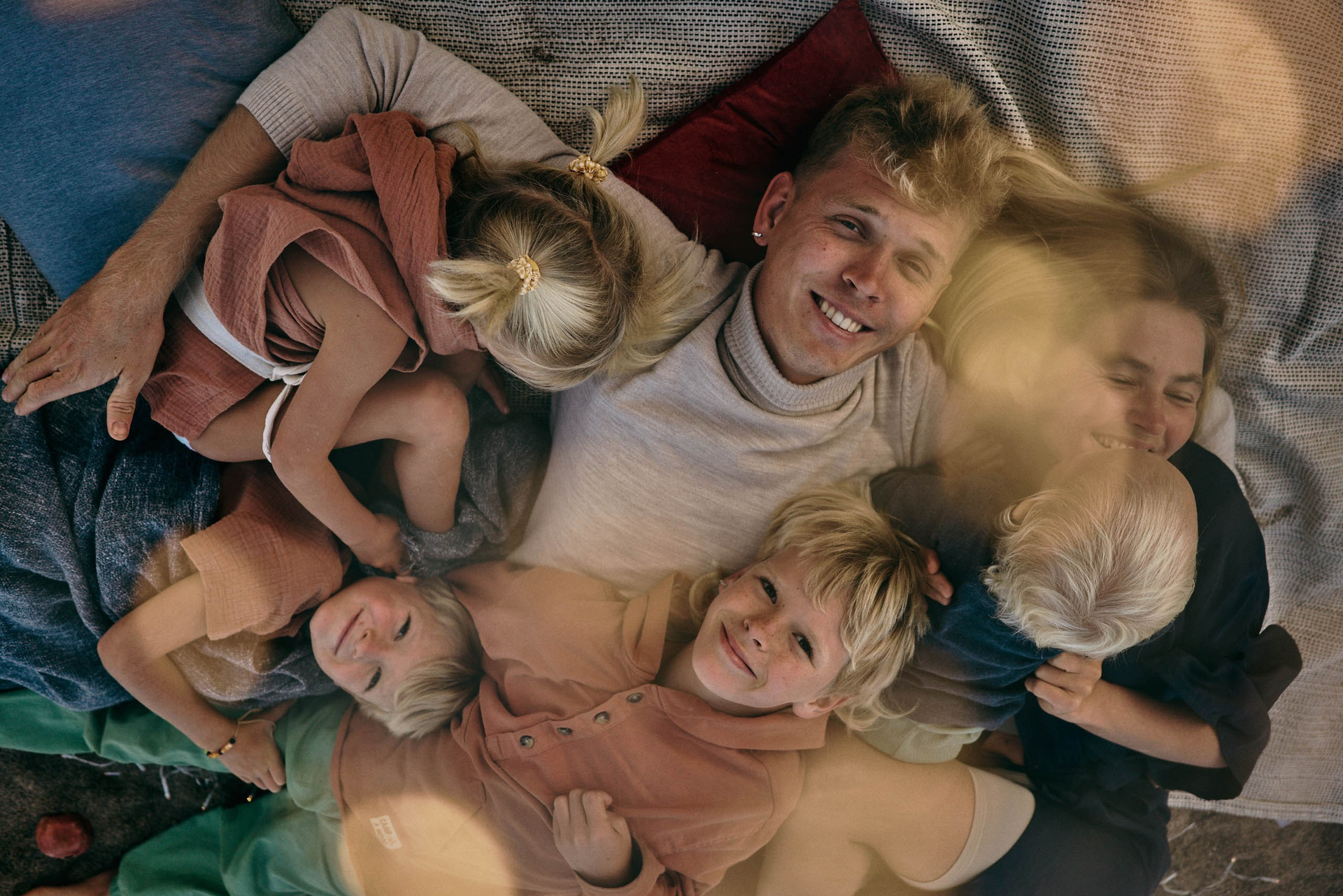 Photographed with a documentary approach, the session focuses on real family dynamics — the way siblings laugh together, how parents balance tender moments with joyful chaos, and the effortless beauty of a large family simply being themselves.