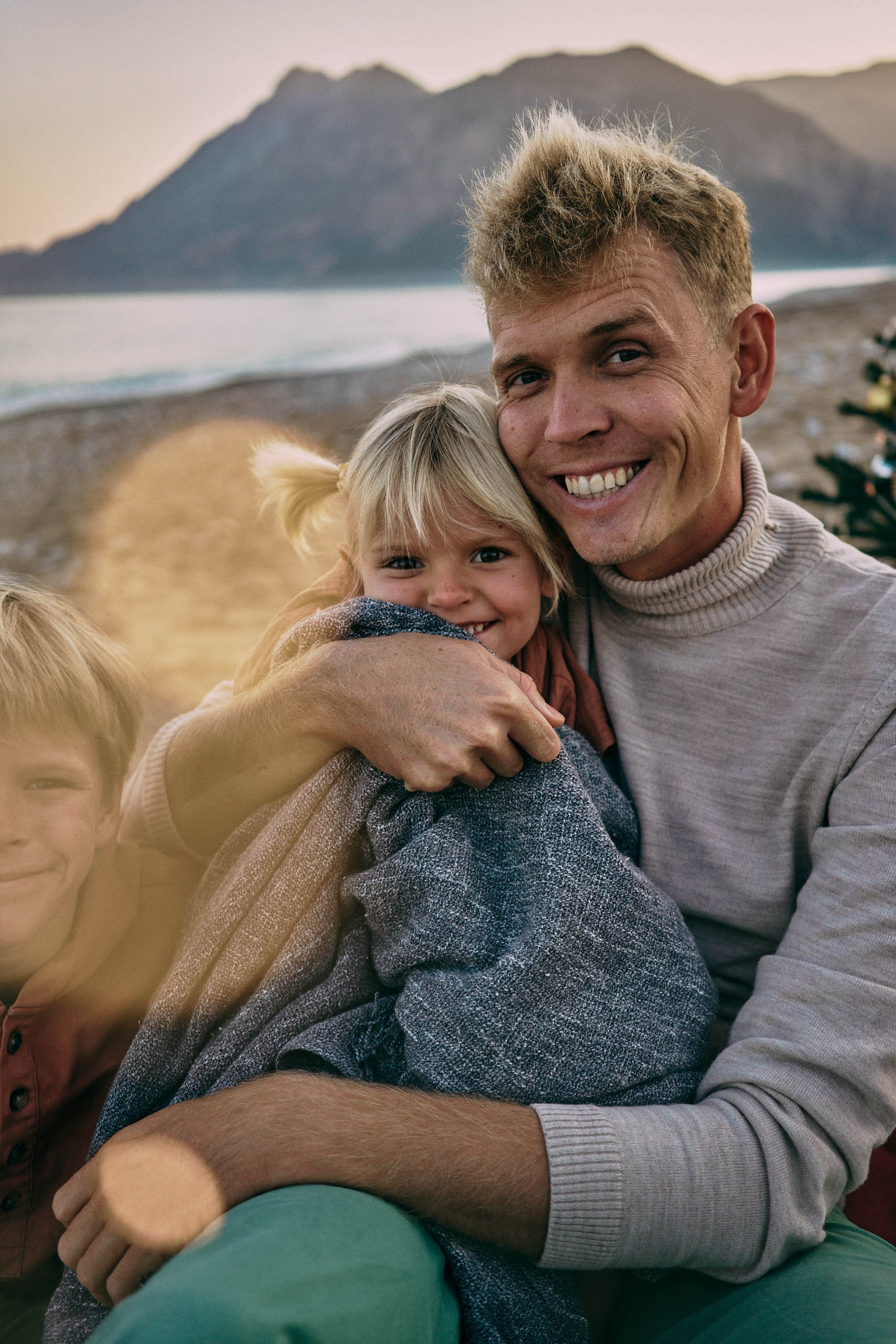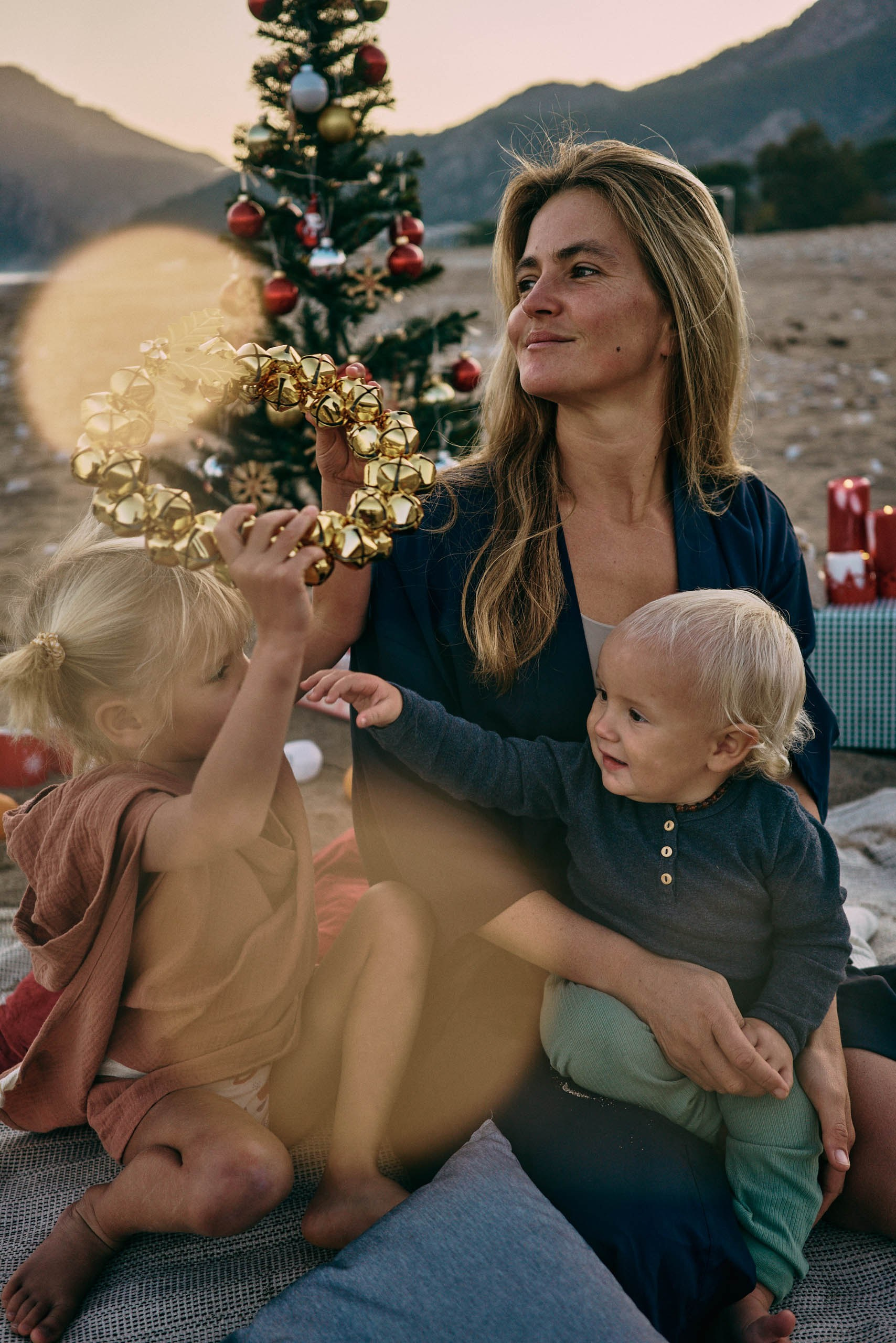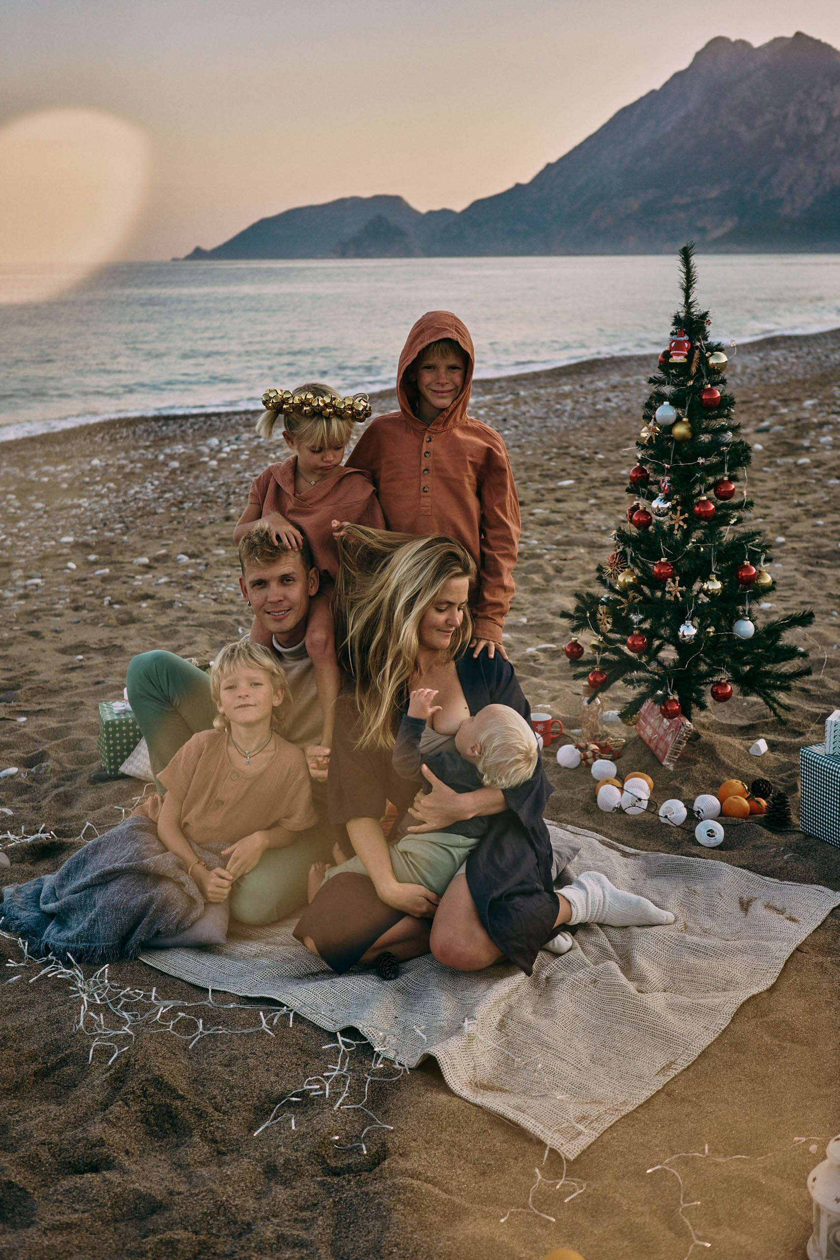 The family spent the evening playing by the shoreline, running along the sand, cuddling together, and enjoying the simple moments that make holidays meaningful. We leaned into the natural beauty of the coast: soft pastel skies, gentle waves, and the calm openness of California’s winter beaches. The holiday mood appeared through warm interactions, matching outfits, and the feeling of togetherness that defines this season.